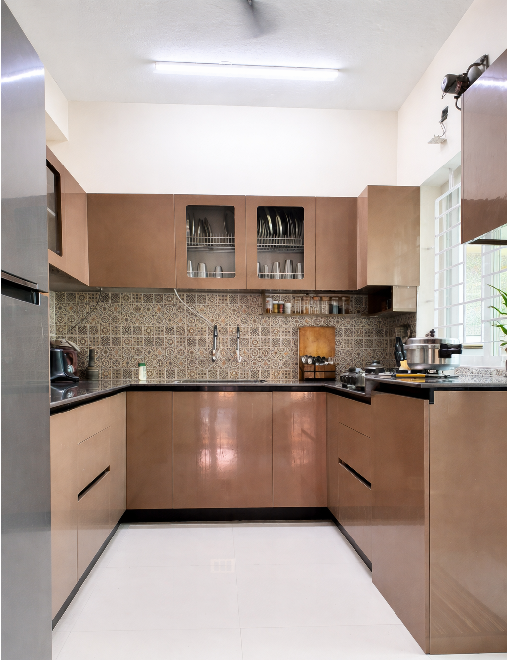 A beautifully designed compact kitchen that perfectly balances style and functionality, making it an ideal choice for modern homes. The sleek glossy cabinets in warm tones add a premium touch, while the U-shaped layout maximizes space efficiency and ensures a smooth workflow. The elegant patterned backsplash enhances the visual appeal, creating a sophisticated backdrop that complements the overall design. Equipped with smart storage solutions, overhead cabinets, and neatly organized shelves, this kitchen offers ample space to keep essentials organized and clutter-free. The durable countertop and well-lit interior further enhance usability, making everyday cooking convenient and enjoyable. Overall, this kitchen design is a perfect blend of elegance and practicality, ideal for homeowners seeking a refined and efficient space.